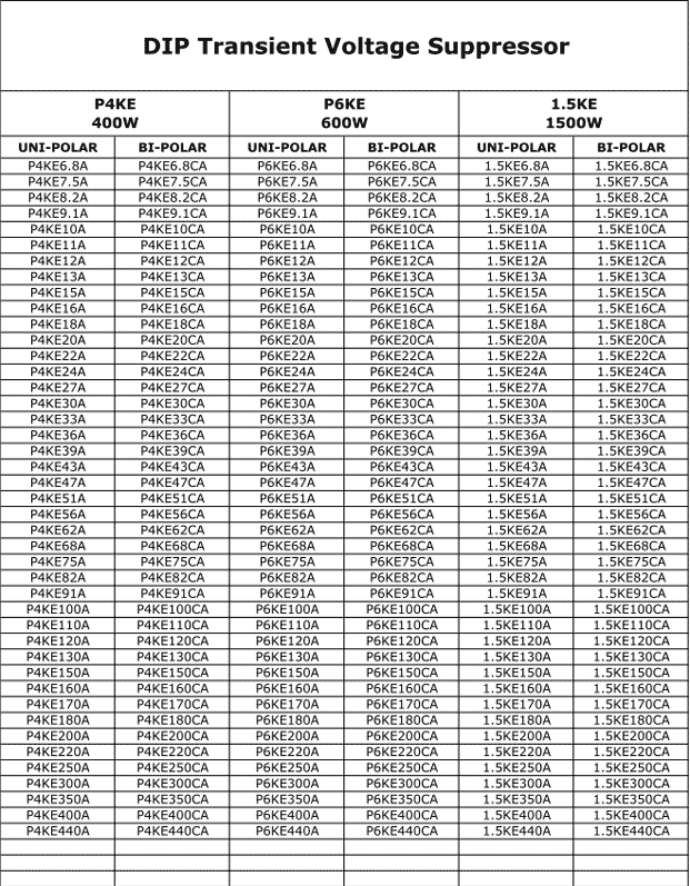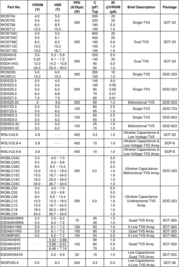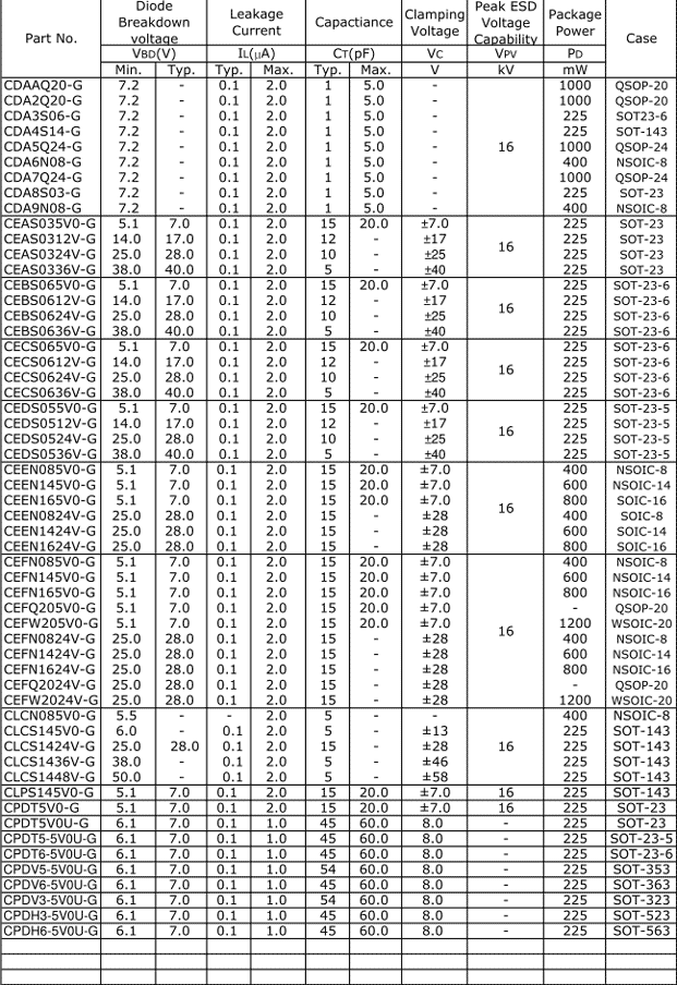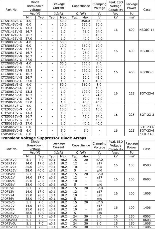 | TVS / ESD suppressor diodes are designed for use in a variety of digital circuit protection applications including computer peripheral ports (IEEE 1284, USB, Firewire, SCSI, gaming, video, keyboard, and DC power), industrial control systems, and audio and network equipment. Comchip TVS / ESD suppressor diodes have characteristics of low capacitance, ultra-fast response time, and stable breakdown that give them significant application advantages over metal oxide varistors. These Comchip TVS / ESD suppressors are RoHS compliant and offer a 16KV ESD suppression at 8/20us transient rating (IEC 61000-4-2). |